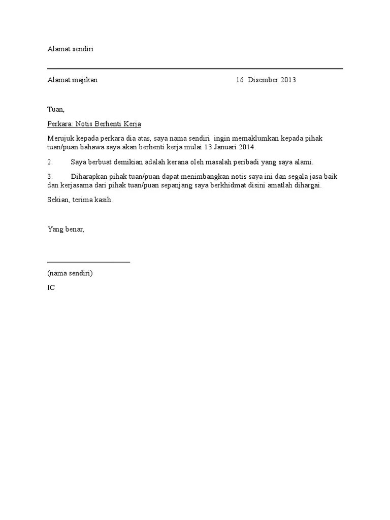 Sebelum resign, hantar dulu surat kepada boss. Resign cara baik, nak masuk semula nanti mudah. Pastikan notis masa yang diberikan menepati kontrak. Cara paling mudah, bertanya kepada hr, tempoh notis berhenti yang perlu anda berikan, . Berikut contoh notis berhenti kerja sebulan, 24 jam, 2 minggu dan seminggu. Contoh surat berhenti kerja (bm dan english), koleksi surat perletakan jawatan resignation letter terbaik notis kerja 24 jam & notis sebulan. Surat perletakan jawatan notis 24 jam & sebulan dalam bahasa melayu/ english bm bi.